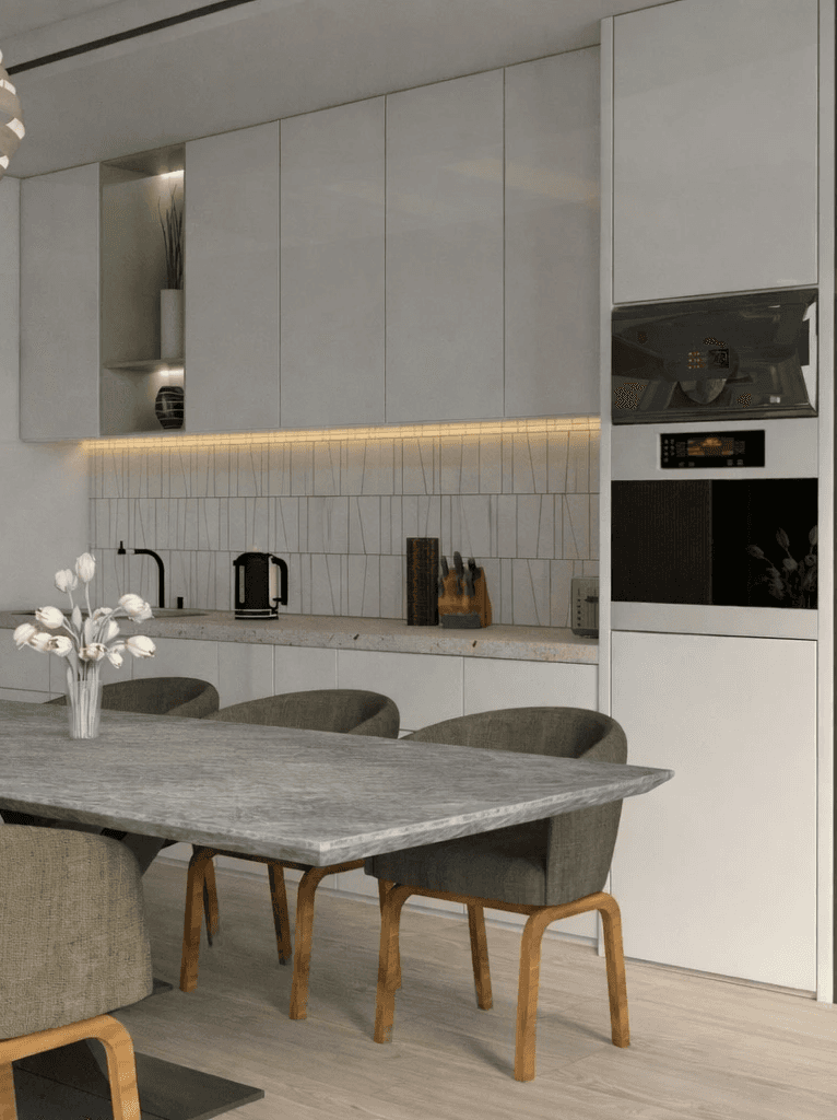 Hapësira dominohet nga linja të pastra dhe sipërfaqe të rrafshëta, ku mobilimi i kuzhinës është i integruar në mënyrë diskrete përgjatë murit. Dollapët me finish mat në tone gri të buta krijojnë një pamje minimaliste dhe të rregullt, duke reflektuar dritën natyrale pa krijuar shkëlqim të tepërt.