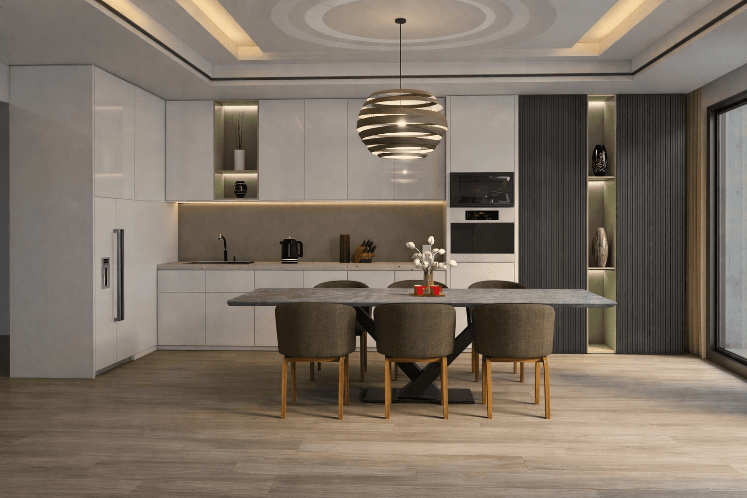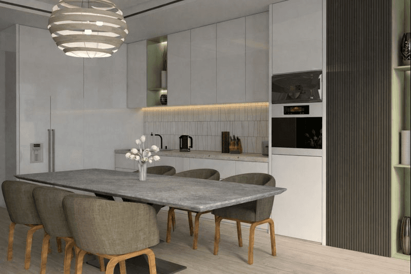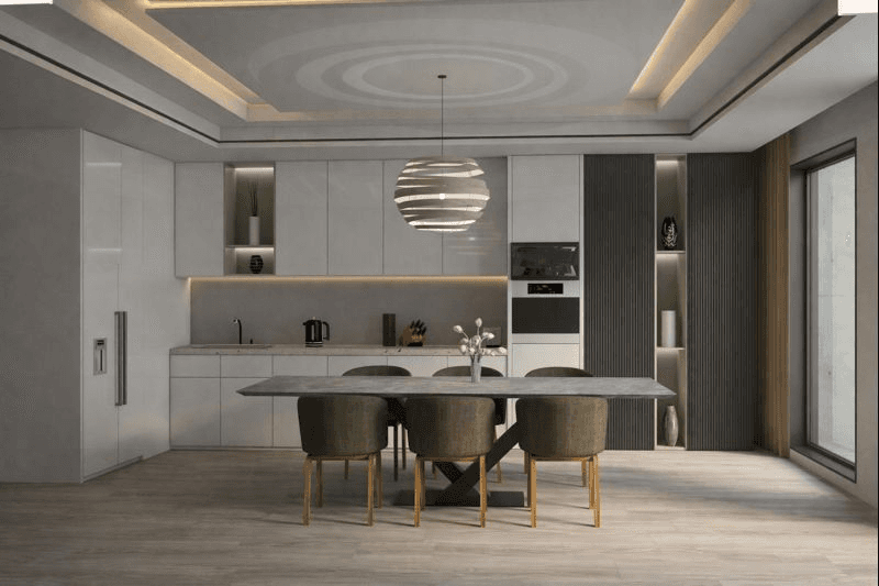 Ky ambient paraqet një kuzhinë–zonë ngrënieje moderne dhe elegante, të konceptuar me fokus te funksionaliteti, pastërtia vizuale dhe atmosfera e qetë bashkëkohore.